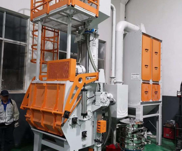 5 抛丸機完全結束後,打開加料門,将工裝及工件吊出。